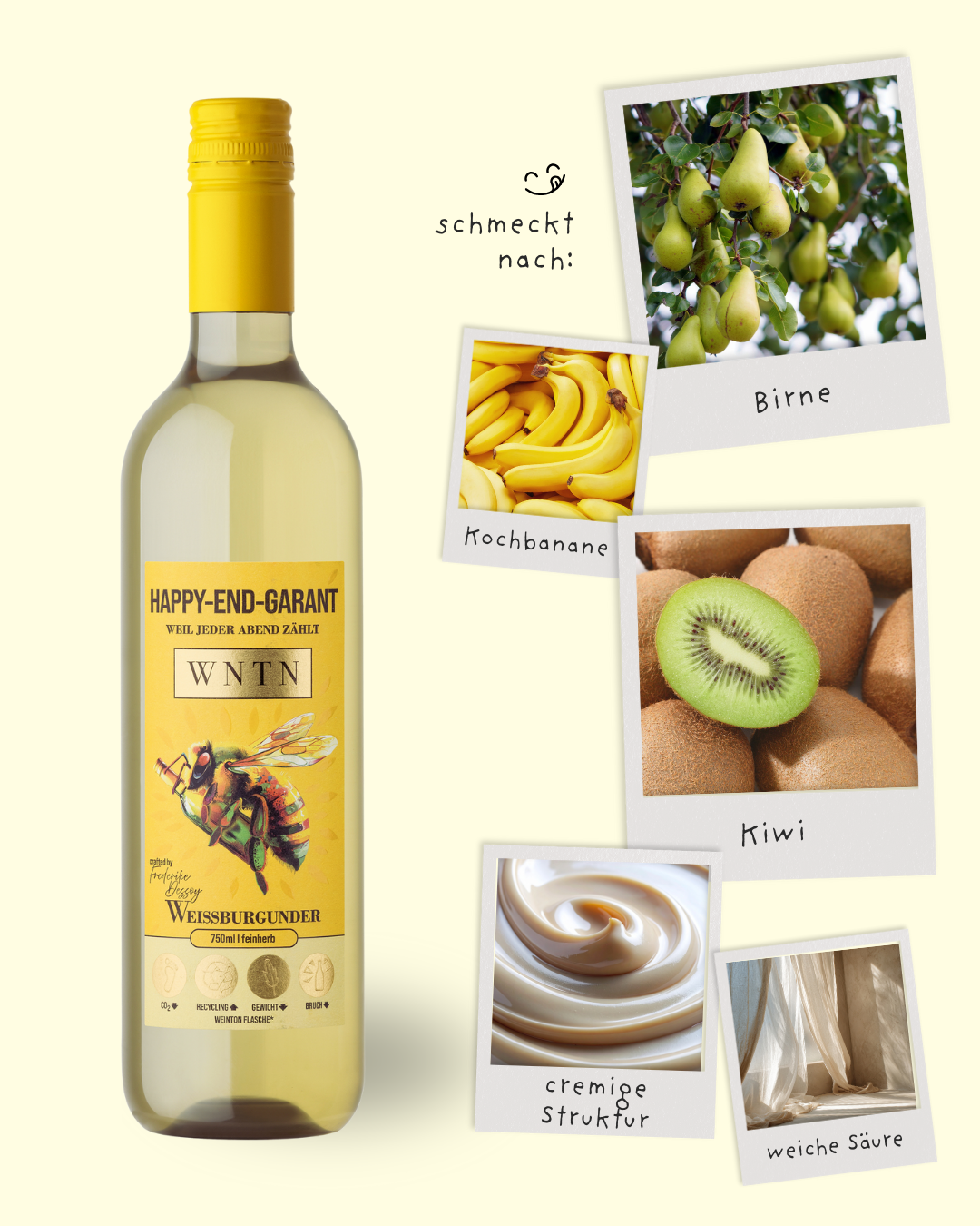 Weißburgunder: Birne, Kochbanane, Kiwi, cremige Struktur, weiche Säure