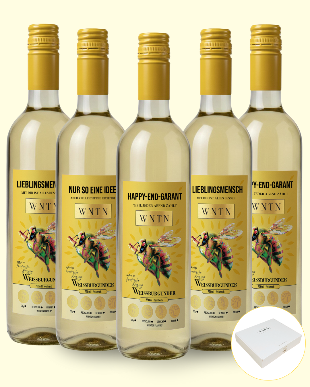 Freu dich auf fünf charmante Weißburgunder mit eigenem Charakter – jede Flasche mit einem eigenen Spruch und einer Extraportion Persönlichkeit. Ideal zum Verschenken, Teilen oder selbst Genießen. Hinweis: Die Kombination der Sprüche kann von der Produktabbildung abweichen.