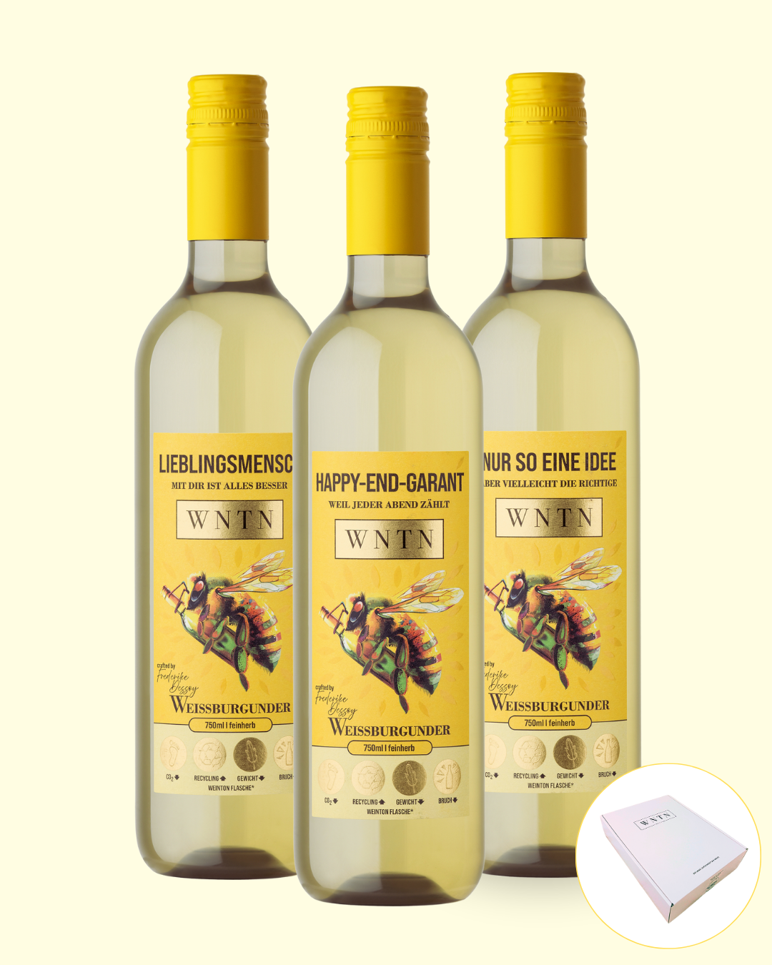 Freu dich auf drei charmante Weißburgunder mit eigenem Charakter – jede Flasche mit einem eigenen Spruch und einer Extraportion Persönlichkeit. Ideal zum Verschenken, Teilen oder selbst Genießen. Hinweis: Die Kombination der Sprüche kann von der Produktabbildung abweichen.