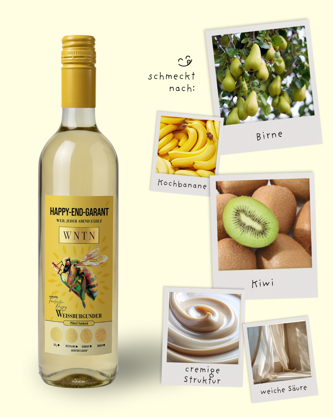 Weißburgunder: Birne, Kochbanane, Kiwi, cremige Struktur, weiche Säure