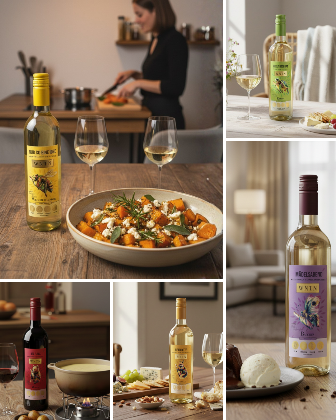 Der Bacchus liebt exotische Küche, asiatische Gerichte oder fruchtige Vorspeisen. Der Weißburgunder passt wunderbar zu cremigen Pastagerichten, Geflügel oder mildem Käse. Der Riesling begleitet Fisch, Meeresfrüchte oder feine vegetarische Gerichte mit Frische und Eleganz. Der Chardonnay fühlt sich bei herzhaften Speisen wie Risotto, gebratenem Fisch oder hellen Fleischgerichten zuhause. Und der Merlot ist der perfekte Partner für würzige Käsesorten, Schmorgerichte oder einen gemütlichen Abend mit dunkler Schokolade.